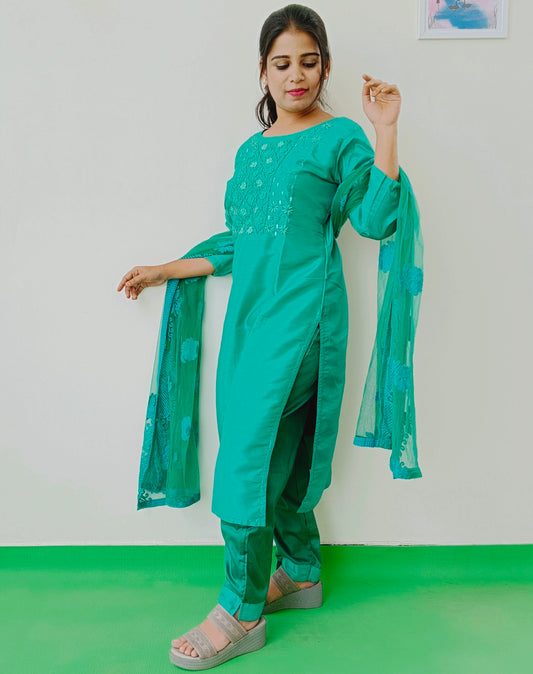 Emerald Green - Liva Silk - Embroidery - Salwar Full Suit